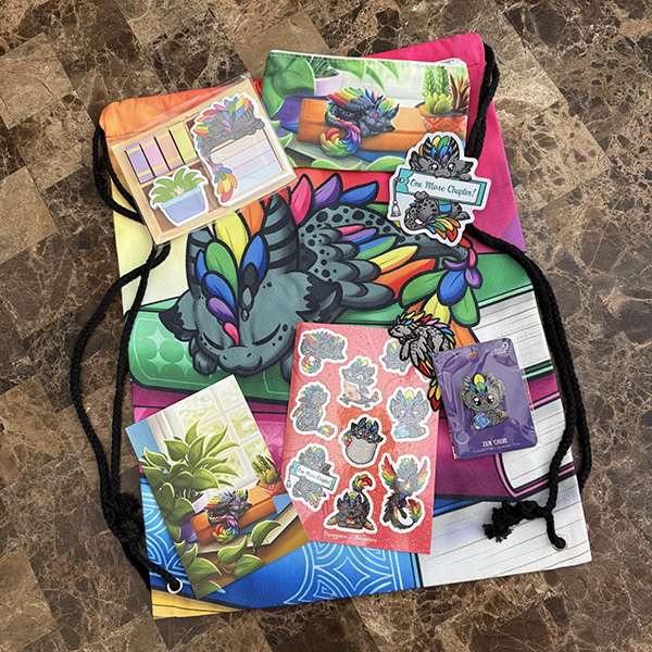 Drawstring DB logo bag, Frostfire Ember vinyl, Holly enamel pin, Rainbow dragon acrylic keychain, DB paintbrush pen, Candycane dragon magnetic bookmark, Gem dragon lanyard, Magnetic closure thumb drive, special wallpapers and coloring pages